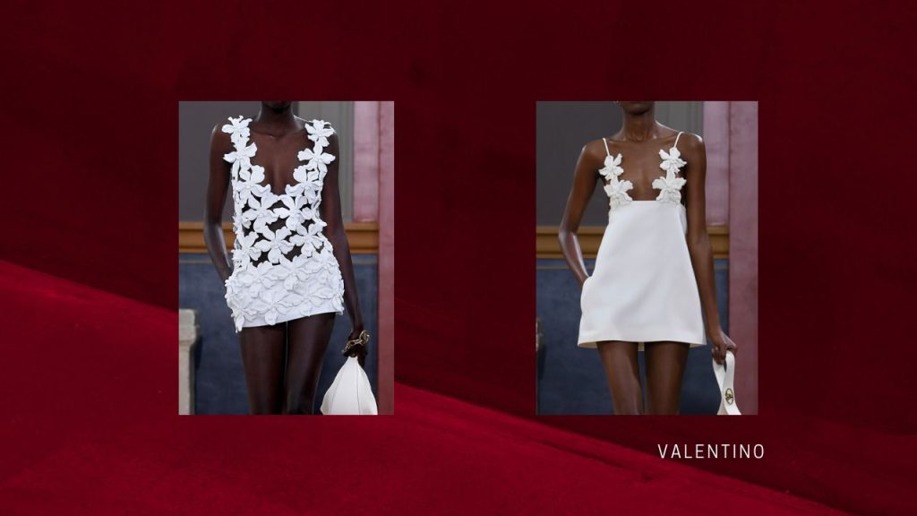 This trend is gaining traction due to the Valenino show at l’école, where the Valentino house showcased several models wearing stiff-cut mini dresses with cut-out flower necklines.